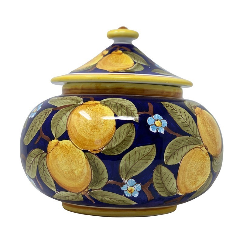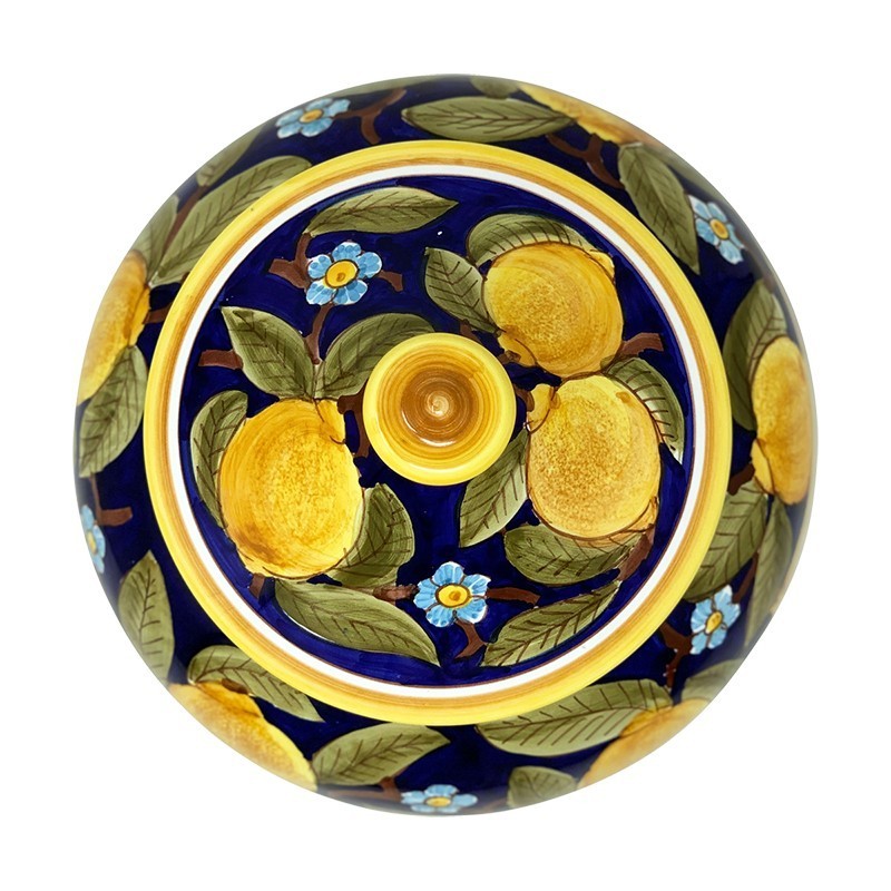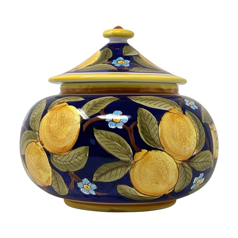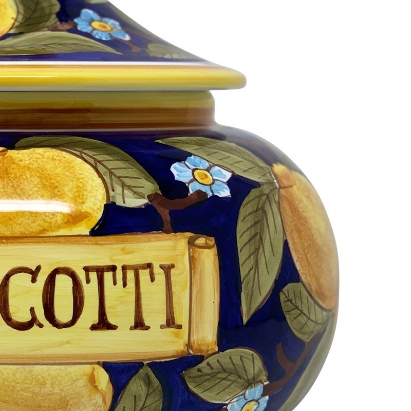 Don't forget to save your customization to be able to add to cartHand painted biscotti jar 10x10x9,5" with Positano Bleu decoration. Lemons and flowers with bleu cobalto background.