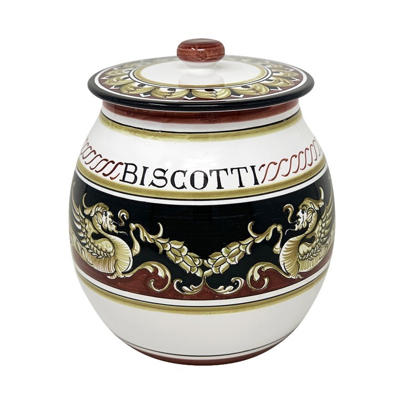Don't forget to save your customization to be able to add to cartHand painted biscotti jar 7,5x7,5x9" with Pompei decoration. The same dragon of Raffaellesco with different colors with Pompeian red and black background.