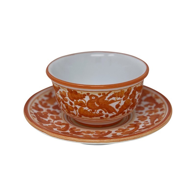 Hand painted Tea Cup and Saucer with Arabesco Blue decoration. The Arabesco decoration was born in the seventeenth century and depicts a bird hidden among undulating branches, with dense foliage, flowering branches and clumps of flowers. In this case it's made entirely with the blue cobalto color.