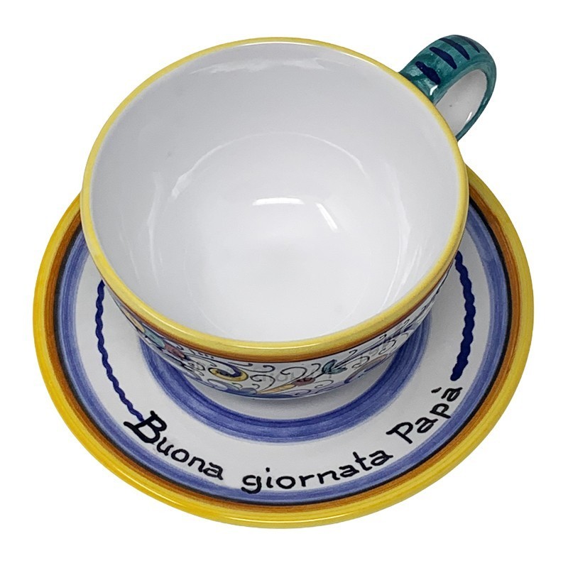 Don't forget to save your customization to be able to add to cartBreakfast cup 4,8" diameter with 7" plate hand painted with Ricco Deruta decoration. The Ricco Deruta decoration is one of the most representative decorations of Deruta and its ceramics. A decoration that dates back to the early 1500s and was also taken up by the fabulous painter Pietro di Cristoforo Vannucci, known as il Perugino.