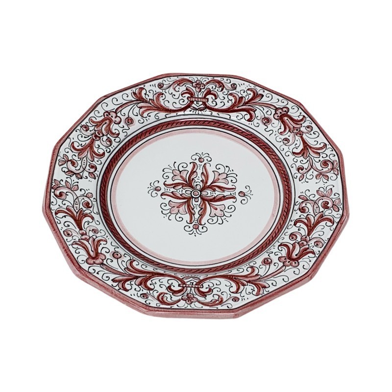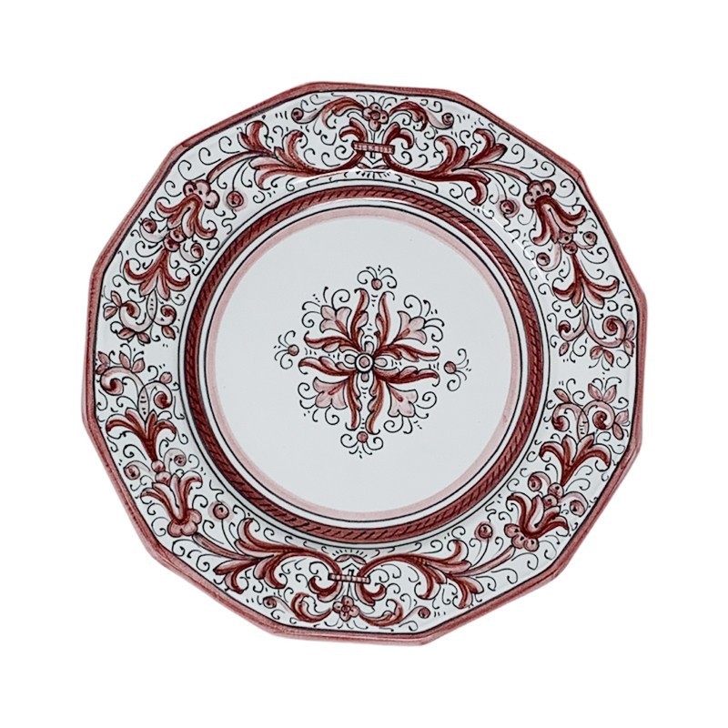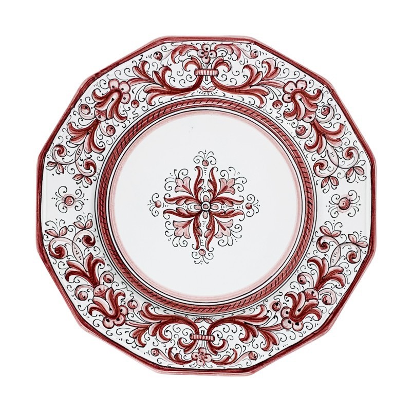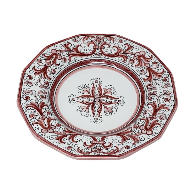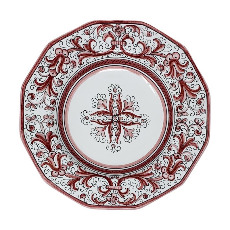Don't forget to save your customization to be able to add to cart12-sided dinner plate hand painted with the classic Deruta decoration, the Rich Deruta but made only with the color Red and its shades.The Ricco Deruta decoration is one of the most representative decorations of Deruta and its ceramics. A decoration that dates back to the early 1500s and was also taken up by the fabulous painter Pietro di Cristoforo Vannucci, known as il Perugino. The 12-sided shape is a F.LLI MARI exclusive.