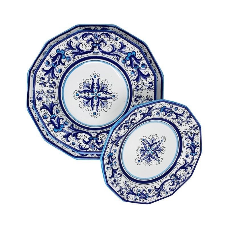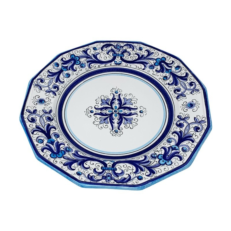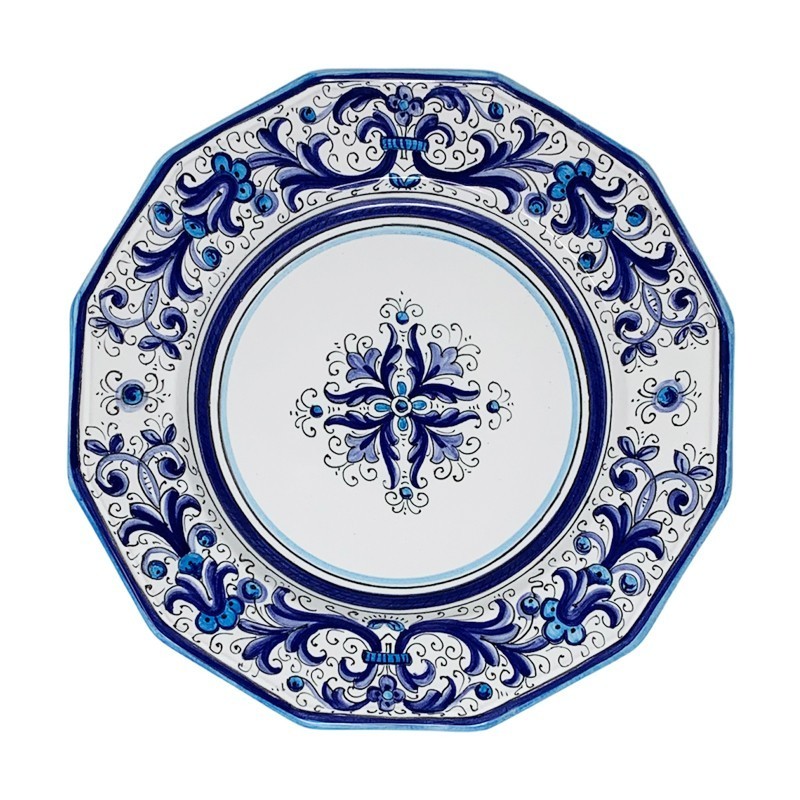 Don't forget to save your customization to be able to add to cart12-sided dinner plate hand painted with the classic Deruta decoration, the Rich Deruta but made only with the color Blue and its shades.The Ricco Deruta decoration is one of the most representative decorations of Deruta and its ceramics. A decoration that dates back to the early 1500s and was also taken up by the fabulous painter Pietro di Cristoforo Vannucci, known as il Perugino. The 12-sided shape is a F.LLI MARI exclusive.