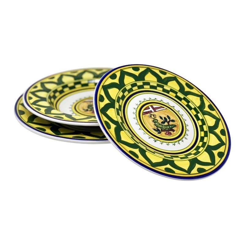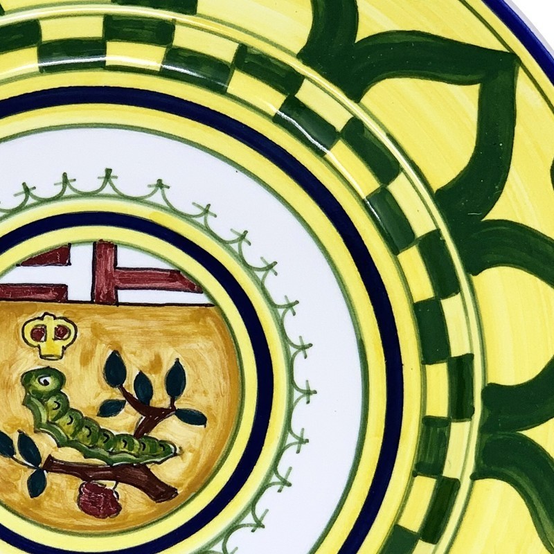 Dinner plates with Bruco decoration entirely hand painted. The oldest document recording The Palio and the oldest documentations of the Contrade date back to the thirteenth century : Contrada originally meant ” a main inhabited street”, then “neighbourhood”  and finally the association of a district’s inhabitants.