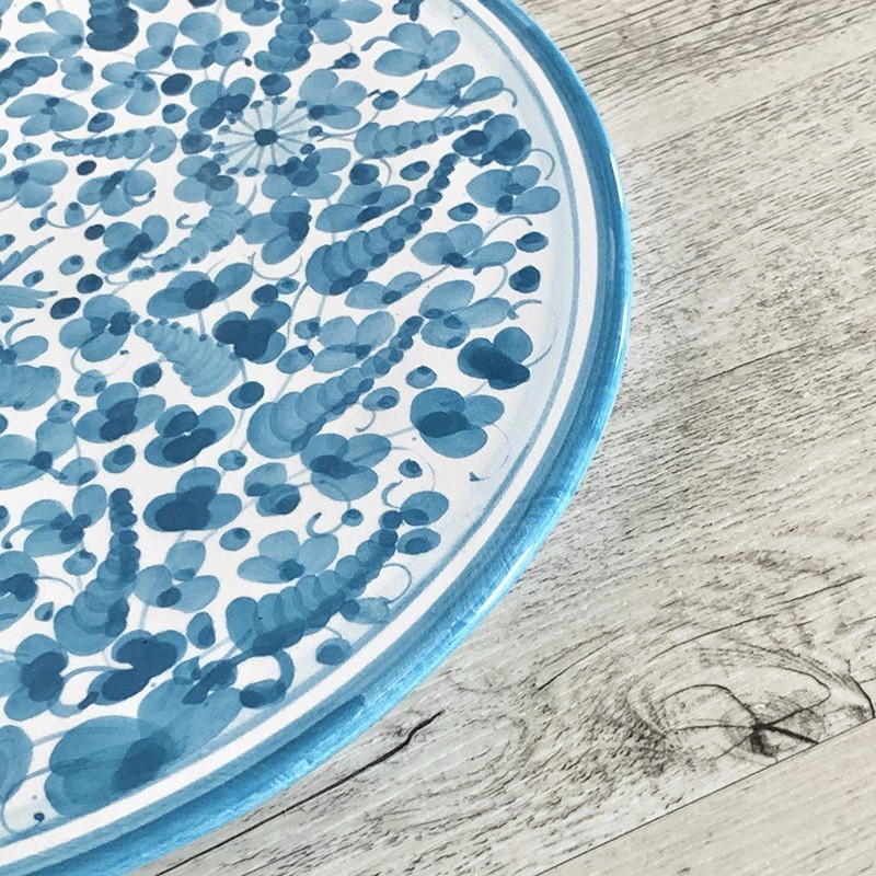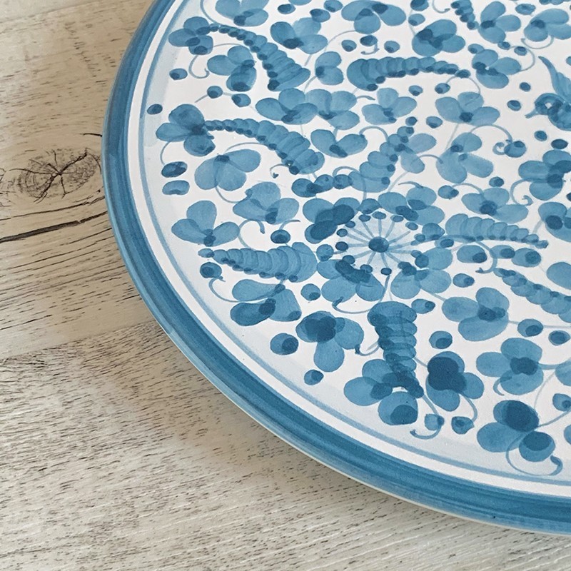 The Arabesco decoration was born in the seventeenth century and depicts a bird hidden among undulating branches, with dense foliage, flowering branches and clumps of flowers. In this case it's made entirely with the turquoise color.