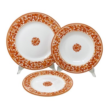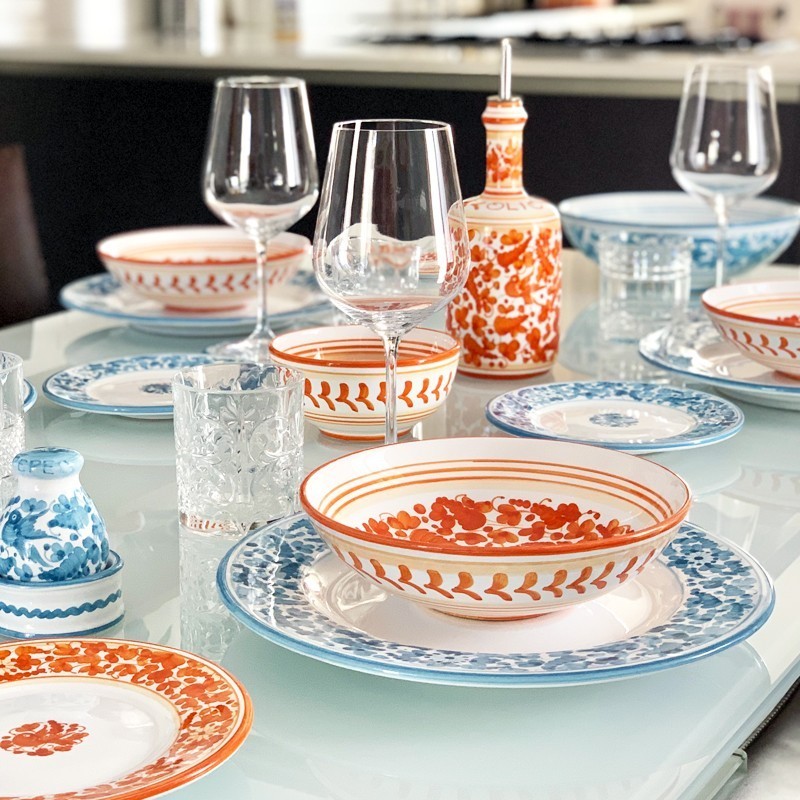 Place Setting with Arabesco decoration.  The Arabesco decoration was born in the 40s and is all painted by hand. It's possible to choose between 3 shades of colors: turquoise, blue or lobster.