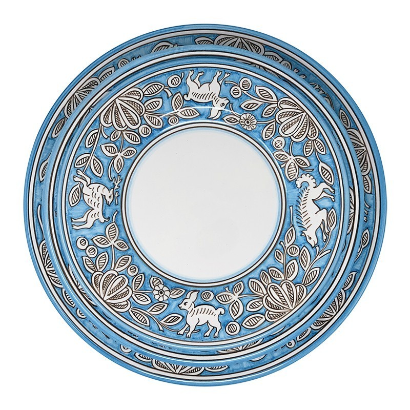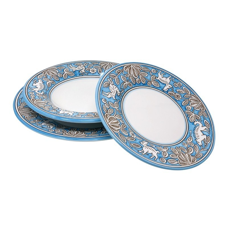 Hand painted place setting with Lepre decoration with dinner plate 11" + Soup plate 10" + Salad plate 9" entirely hand painted. It's possible choose between two different background colors. Linen or Turquoise.