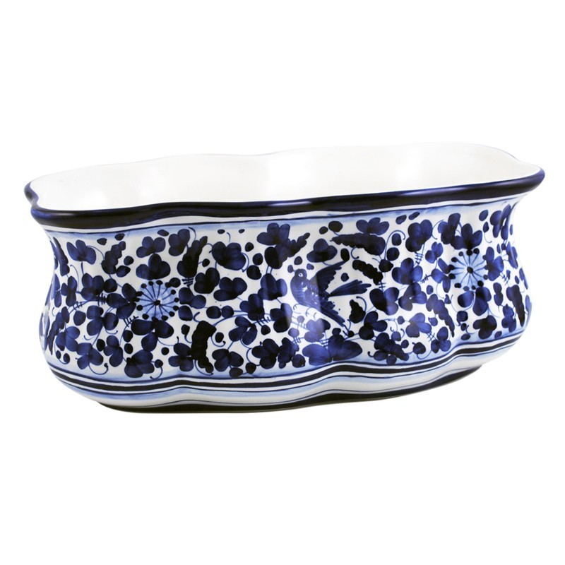 Don't forget to save your customization to be able to add to cartHand painted rectangular planter 15x8x6" with Arabesco Blue decoration. The Arabesco decoration was born in the seventeenth century and depicts a bird hidden among undulating branches, with dense foliage, flowering branches and clumps of flowers.