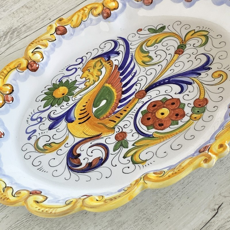 Don't forget to save your customization to be able to add to cartHand painted Raffaellesco scalloped oval tray 13x11".The dragon of Raffaellesco was taken up by the master craftsmen od Deruta who reinterpreted frescoes of Raffaello. The famous painter of Renaissance was in turn inspired by the anthropomorphic figures discovered ate the end of the 1400s in Domus Aurea of Nerone.