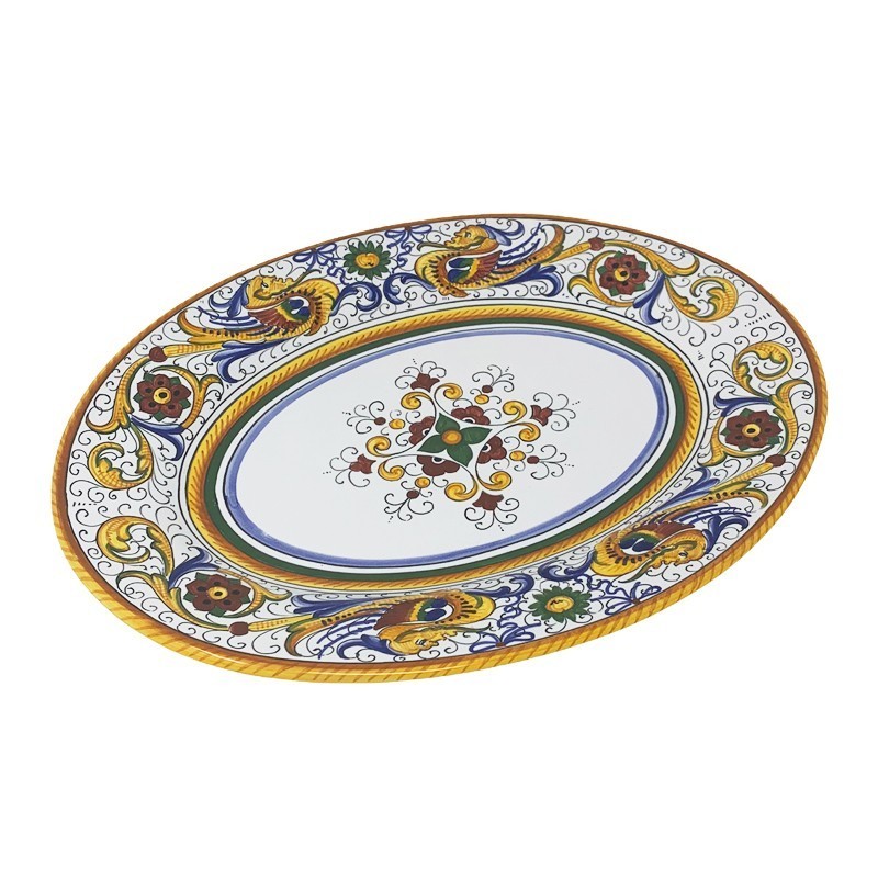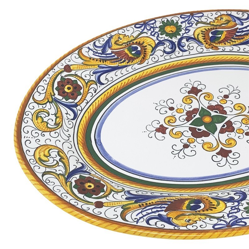 Don't forget to save your customization to be able to add to cartHand painted Raffaellesco oval tray.The dragon of Raffaellesco was taken up by the master craftsmen od Deruta who reinterpreted frescoes of Raffaello. The famous painter of Renaissance was in turn inspired by the anthropomorphic figures discovered ate the end of the 1400s in Domus Aurea of Nerone.