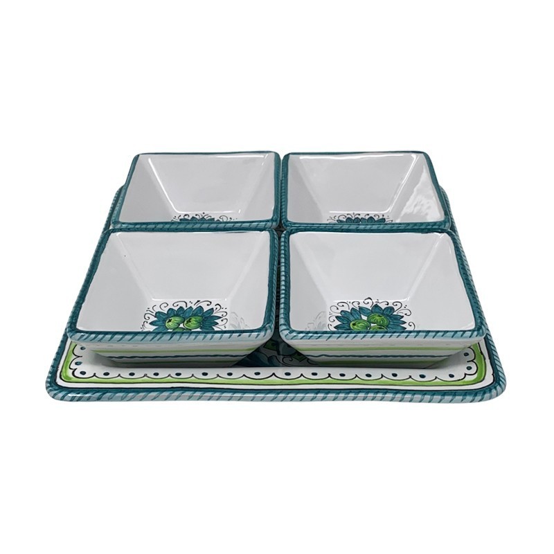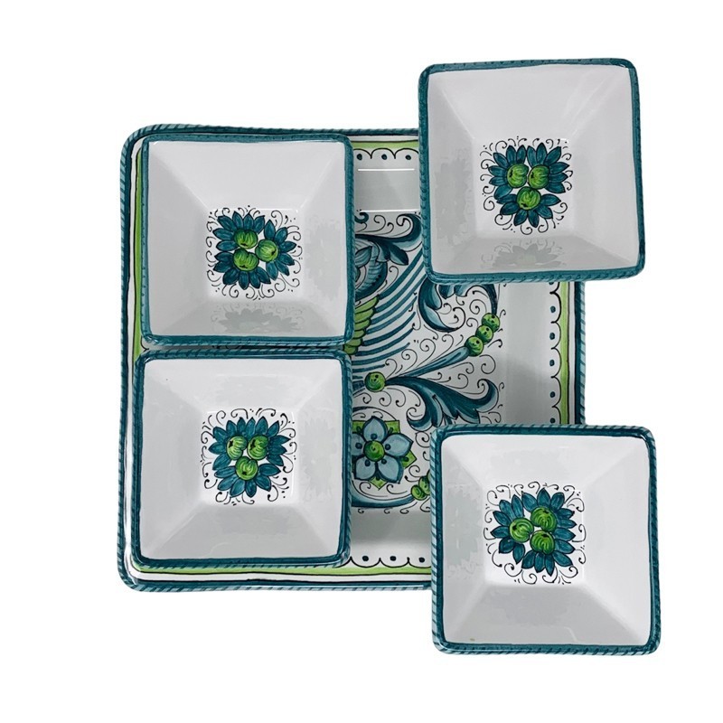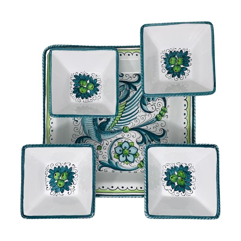 Raffaellesco 10x10" Oriental Snack Trays Sun. The dragon of Raffaellesco was taken up by the master craftsmen od Deruta who reinterpreted frescoes of Raffaello. The famous painter of Renaissance was in turn inspired by the anthropomorphic figures discovered ate the end of the 1400s in Domus Aurea of Nerone.