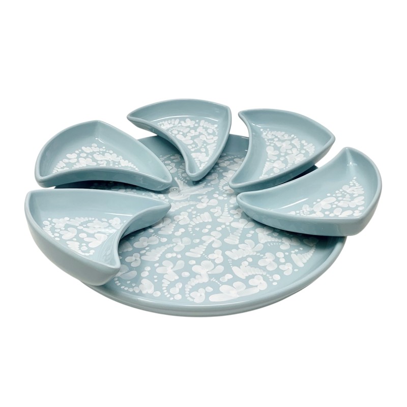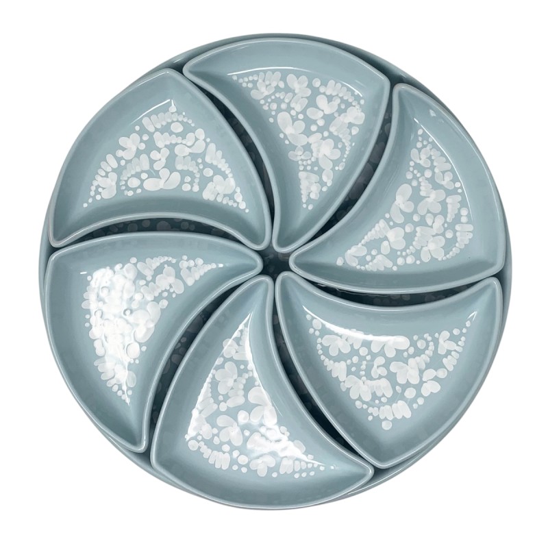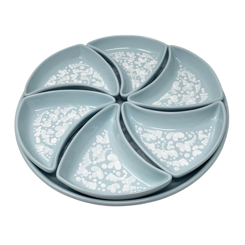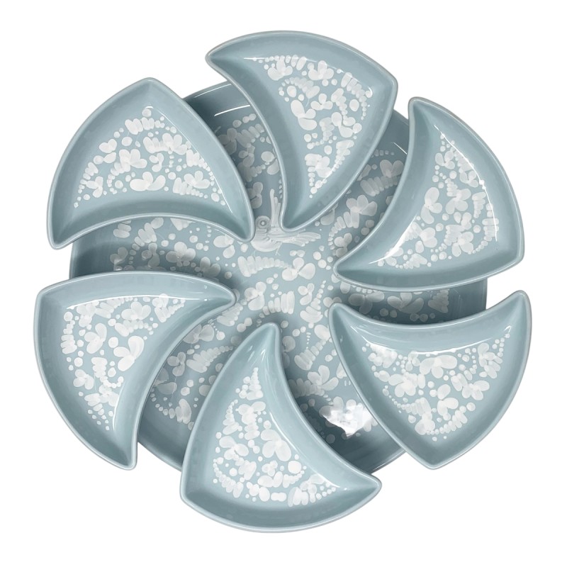 While Arabesco is known for its complexity and vibrant color palette, Nuvola opts for the power of monochrome. Each piece features a lustrous white motif that delicately emerges from a soft, calming light green base glaze. This color combination is intentional: white symbolizes lightness, purity, and timeless elegance, while light green evokes the serenity of nature, rebirth, and a sense of calm and harmony.