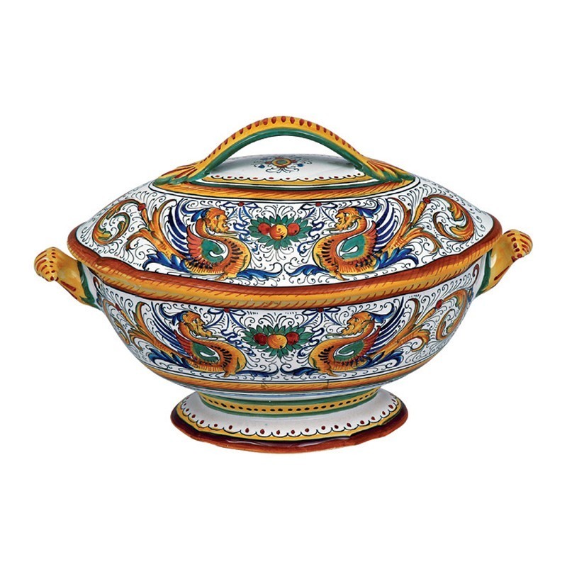 Don't forget to save your customization to be able to add to cartHand painted soup tureen 15" with the typical decoration of Deruta, the Raffaellesco.The dragon of Raffaellesco was taken up by the master craftsmen od Deruta who reinterpreted frescoes of Raffaello. The famous painter of Renaissance was in turn inspired by the anthropomorphic figures discovered ate the end of the 1400s in Domus Aurea of Nerone.