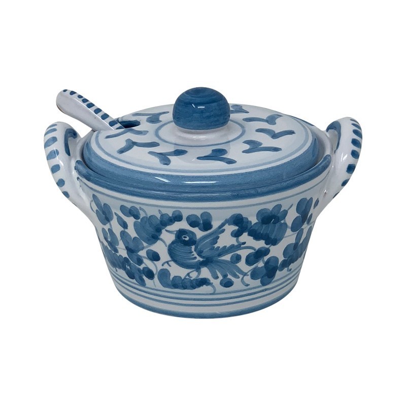 Don't forget to save your customization to be able to add to cartHand painted Arabesco Turquoise covered parmesan cheese bowl with spoon. The Arabesco decoration was born in the seventeenth century and depicts a bird hidden among undulating branches, with dense foliage, flowering branches and clumps of flowers. In this case it's made entirely with the turquoise color.