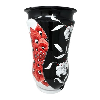 This decoration combines the beauty of lilies with the magnificent decoration of the red Peacock creating a truly fascinating visual harmony. The whole is framed by an elegant black background that highlights the bright colors and minute details of the flowers. It's a work that not only enriches the environment, but also tells a story of tradition and craftsmanship.