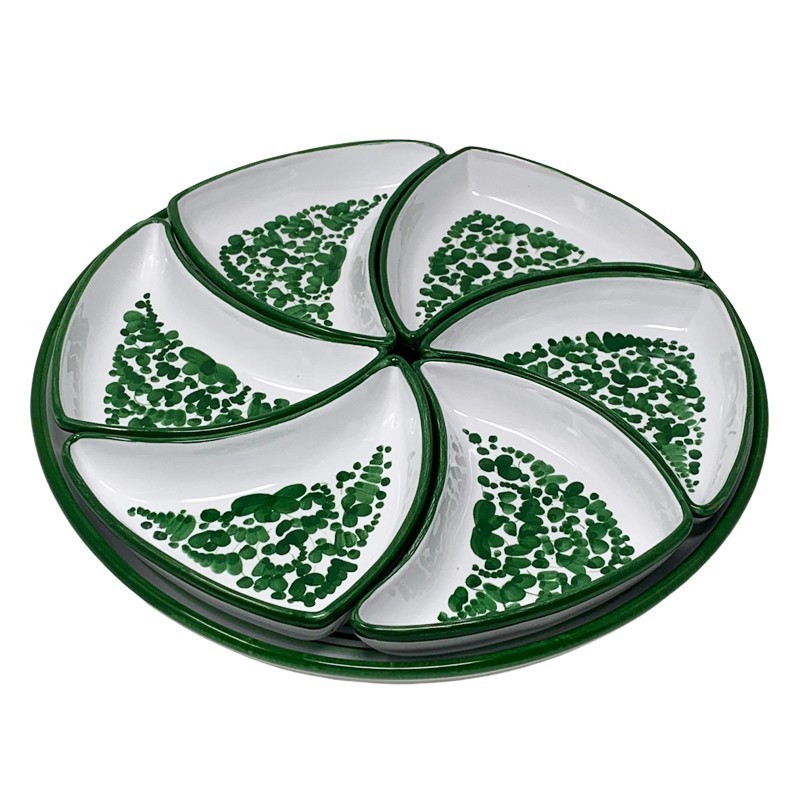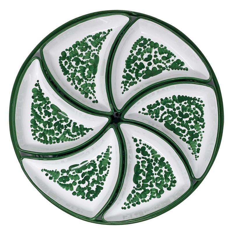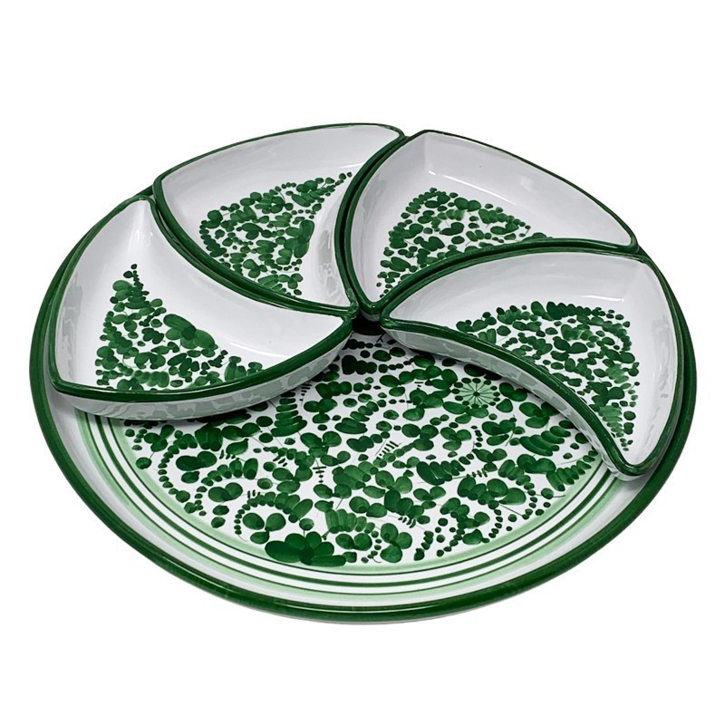 Antipastiera sole diametro 40cm con decoro Arabesco. Il decoro Arabesco nasce nel XVII secolo e raffigura un uccello nascosto tra tralci ondulati con fitto fogliame, rami fioriti e cespi di fiori.