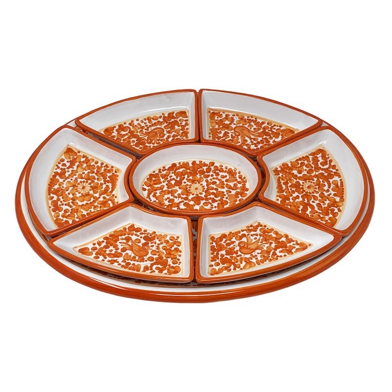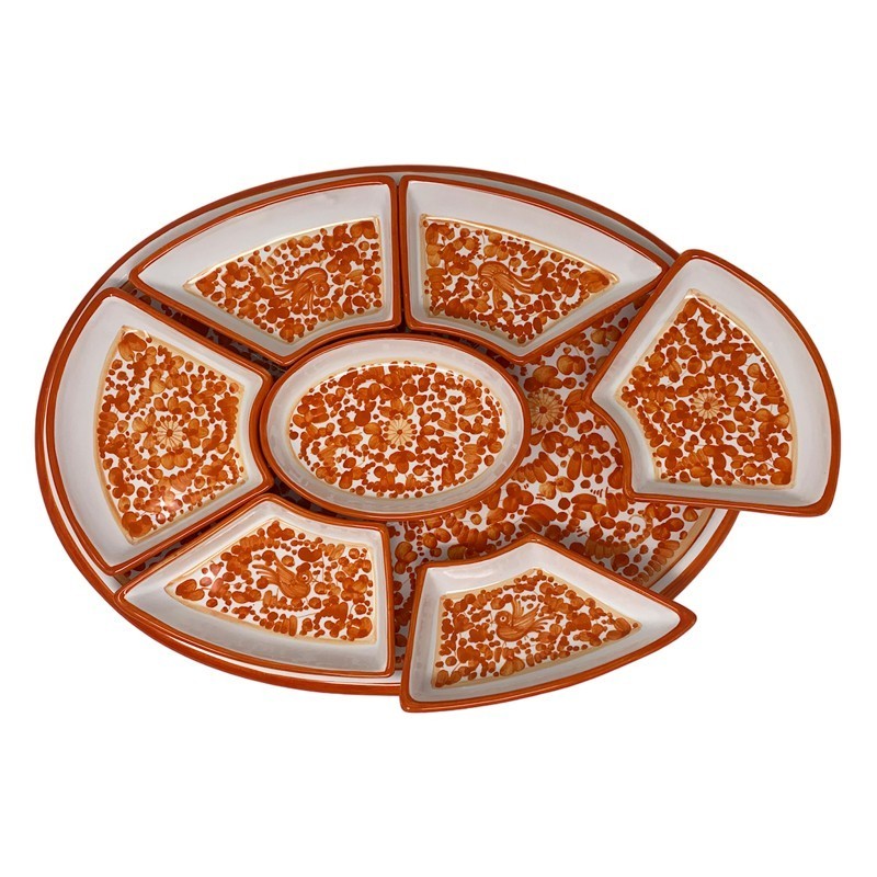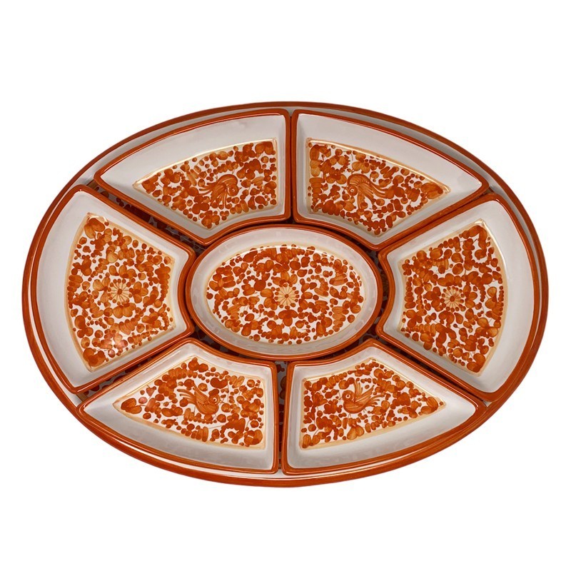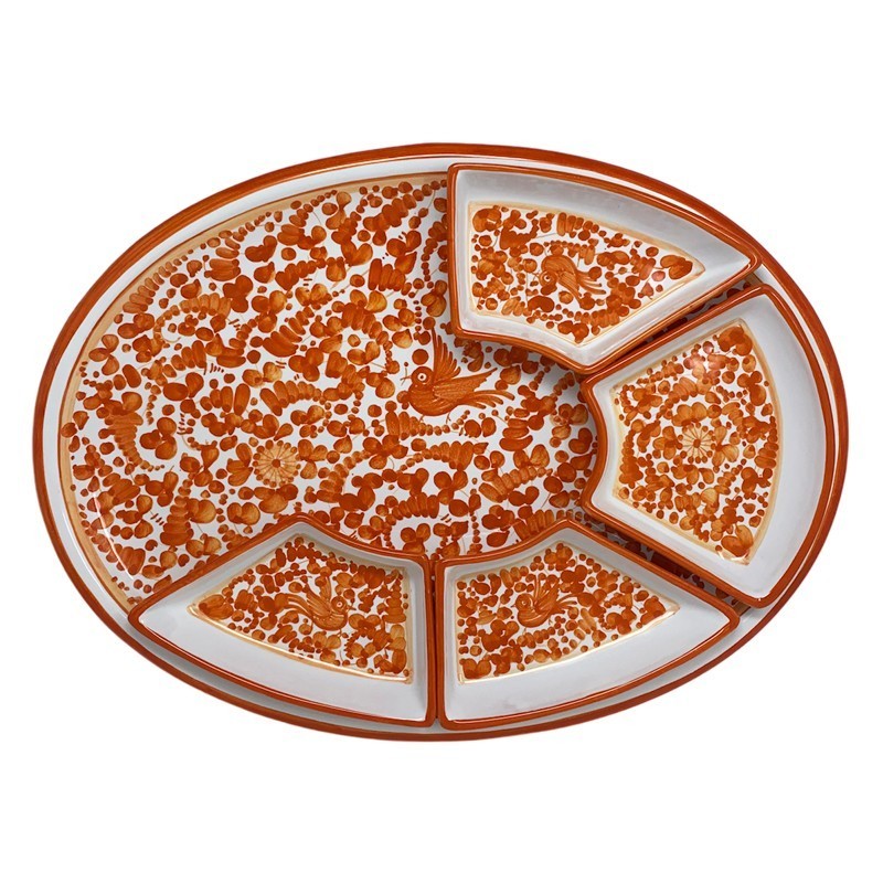 Antipastiera ovale 50x40cm con decoro Arabesco. Il decoro Arabesco nasce nel XVII secolo e raffigura un uccello nascosto tra tralci ondulati con fitto fogliame, rami fioriti e cespi di fiori.