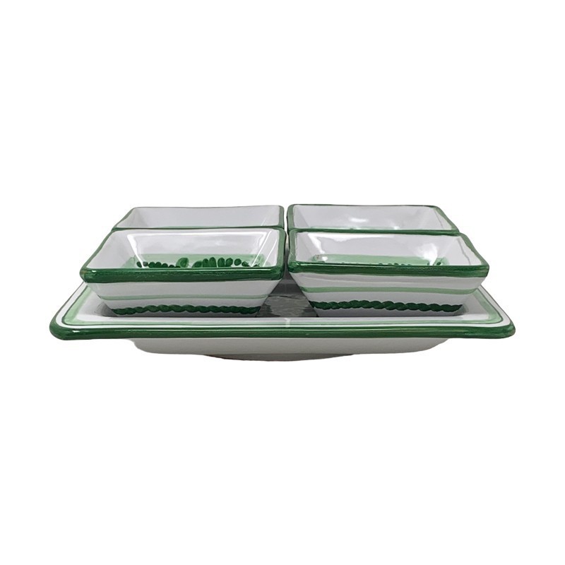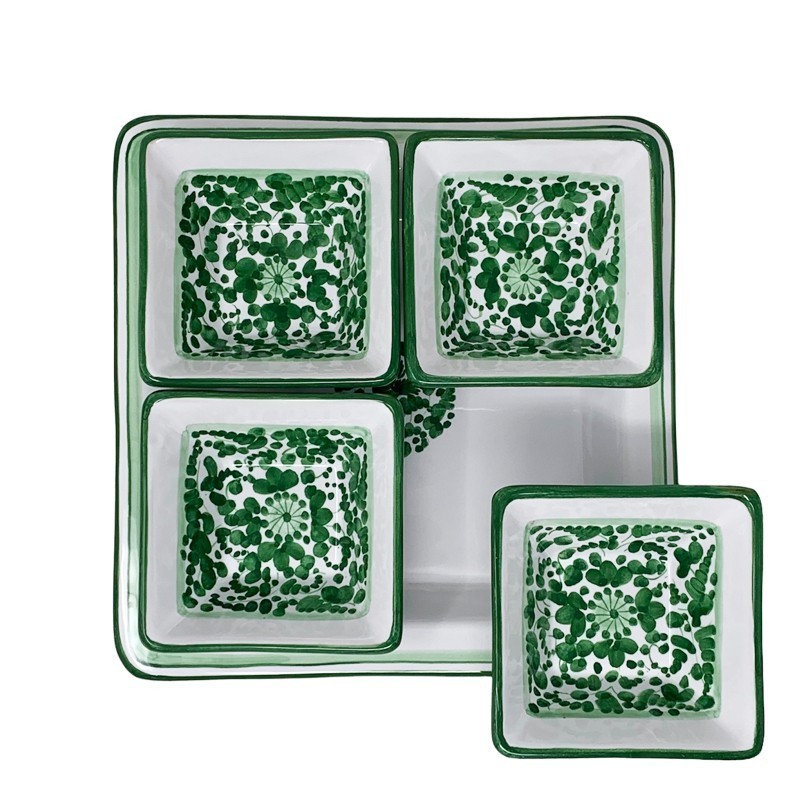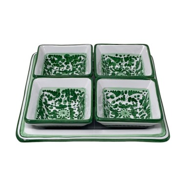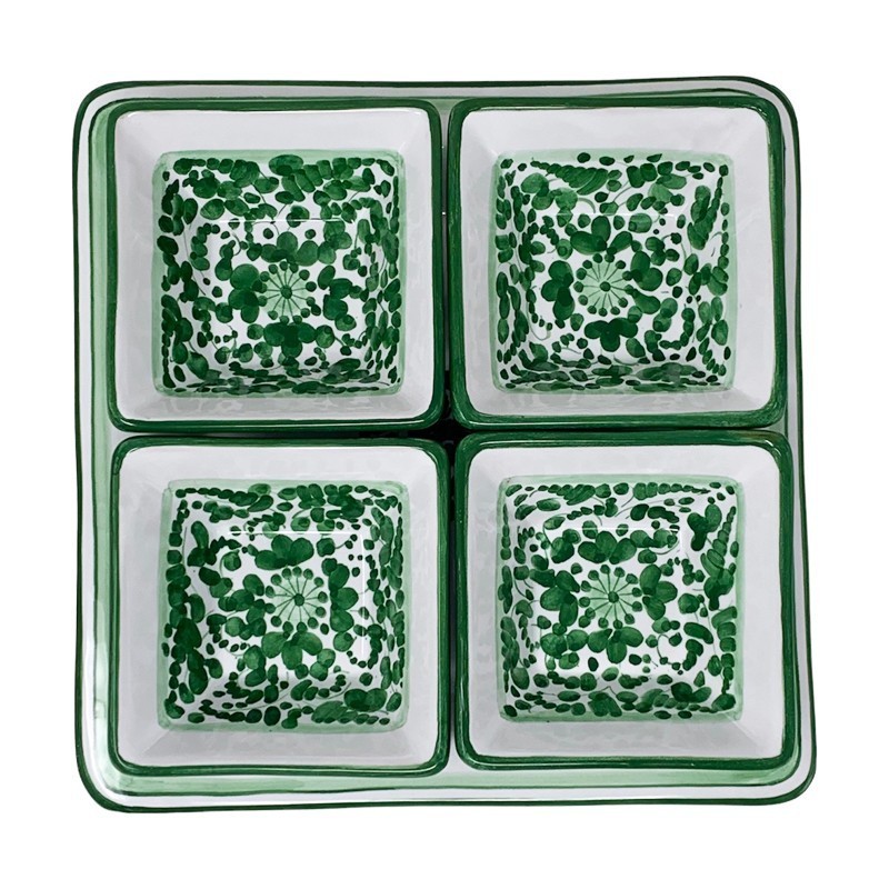 Antipastiera quadrata 26x26cm con decoro Arabesco. Il decoro Arabesco nasce nel XVII secolo e raffigura un uccello nascosto tra tralci ondulati con fitto fogliame, rami fioriti e cespi di fiori.