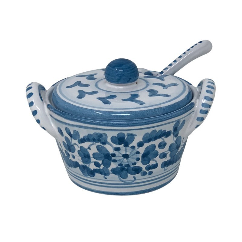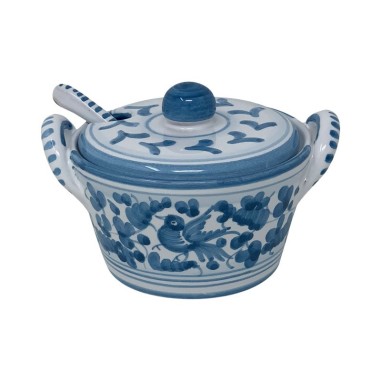 Formaggiera con mestolo dipinta a mano con decoro Arabesco Turchese. Il decoro Arabesco nasce nel XVII secolo e raffigura un uccello nascosto tra tralci ondulati con fitto fogliame, rami fioriti e cespi di fiori. In questo caso è realizzato interamente con il colore turchese.