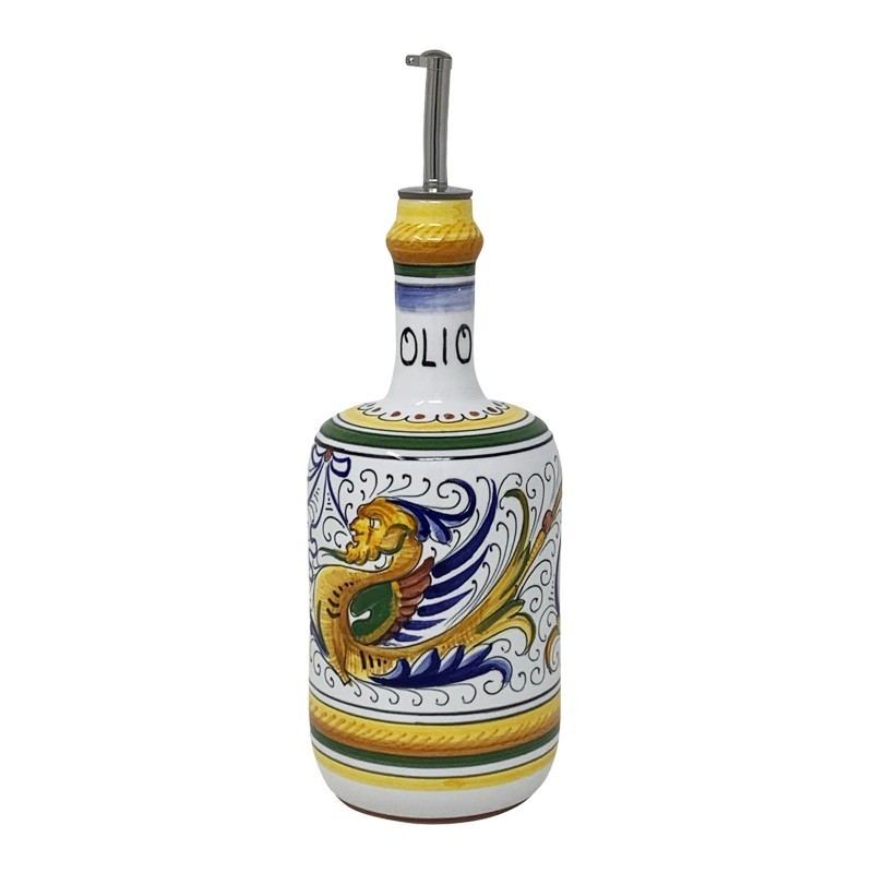 Oliera 10x10x25cm con la decorazione classica di Deruta interamente decorata a mano. Deliziosamente confezionata con il suo certificato di garanzia ed il suo tappo dosatore in acciaio inox all'interno di una scatola trasparente. Ideale per un regalo. Il Raffaellesco è il decoro per eccellenza della produzione derutese. Il drago fu ripreso dai maestri artigiani di Deruta che reinterpretarono gli affreschi di Raffaello. Il celebre pittore rinascimentale si era a sua volta ispirato alle figure antropomorfe scoperte alla fine del 1400 nella Domus Aurea di Nerone.