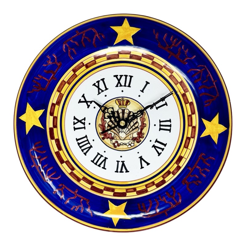 Orologio da muro 30cm dipinto interamente a mano con decoro Palio di Siena - Nicchio. Il più antico documento riguardo il palio e le più antiche testimonianze delle Contrade risalgono al tredicesimo secolo: la parola "contrada" originariamente significava "strada abitata", poi "quartiere" ed infine "associazione degli abitanti di un distretto".