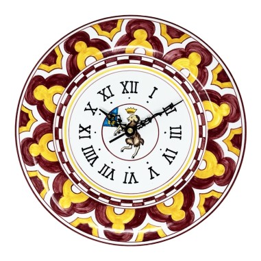 Orologio da muro 30cm dipinto interamente a mano con decoro Palio di Siena - Montone. Il più antico documento riguardo il palio e le più antiche testimonianze delle Contrade risalgono al tredicesimo secolo: la parola "contrada" originariamente significava "strada abitata", poi "quartiere" ed infine "associazione degli abitanti di un distretto".