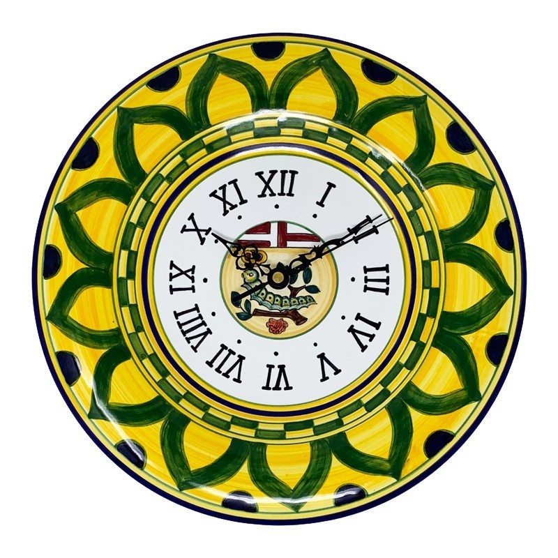 Orologio da muro 30cm dipinto interamente a mano con decoro Palio di Siena - Bruco. Il più antico documento riguardo il palio e le più antiche testimonianze delle Contrade risalgono al tredicesimo secolo: la parola "contrada" originariamente significava "strada abitata", poi "quartiere" ed infine "associazione degli abitanti di un distretto".