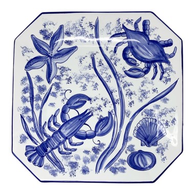 Piatto da muro dipinto e creato a mano 35x35 decoro Vita di Mare, una celebrazione della profondità e della serenità degli abissi marini, espressa attraverso una palette monocromatica di blu o turchese.
