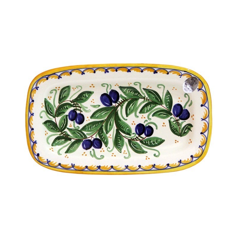 Piatto da muro creato e dipinto a mano con il decoro Olive. Già fornito dei fori per essere appeso sia verticalmente che orizzontalmente.