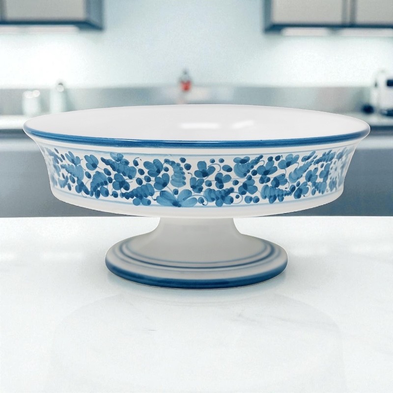 Fruttiera dipinta a mano 30x30x14cm decoro Arabesco Turchese. Il decoro Arabesco nasce nel XVII secolo e raffigura un uccello nascosto tra tralci ondulati con fitto fogliame, rami fioriti e cespi di fiori. In questo caso è realizzato interamente con il colore turchese.