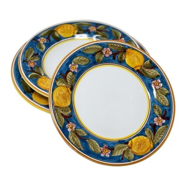 Piatto da tavola dipinto a mano con limoni e fiori su fondo colorato. E' possibile scegliere tra 4 diversi colori: rosso fuoco, nero, blu o turchese.