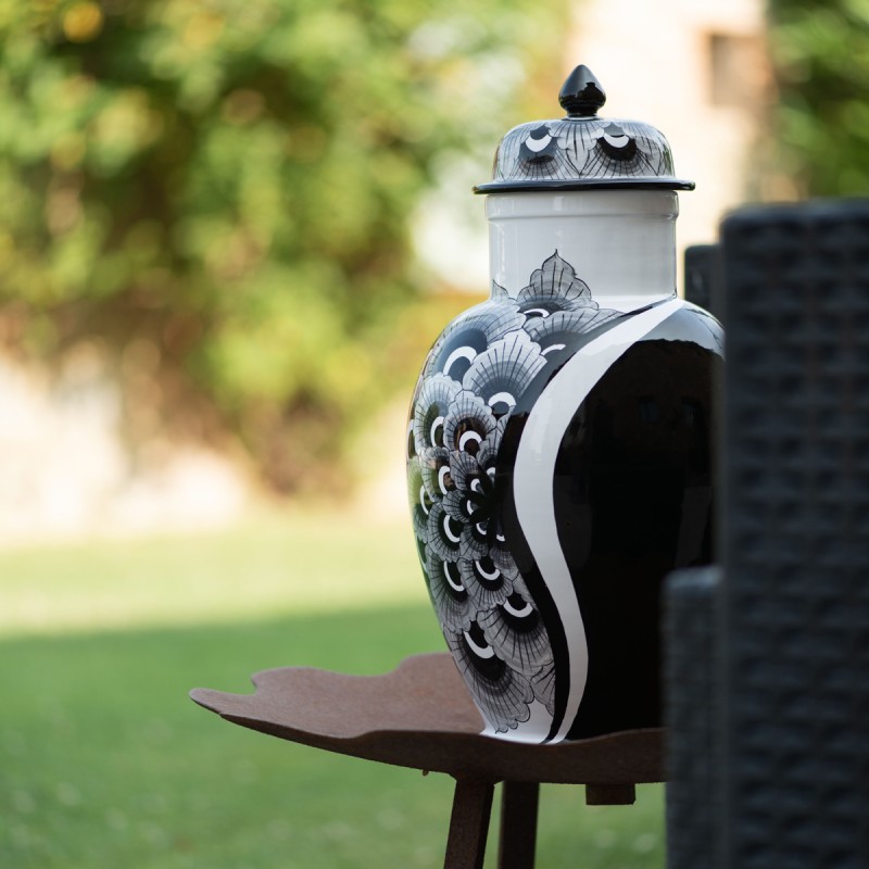 Vaso farmacia creato al tornio e dipinto completamente a mano con decoro Pavone Nero.