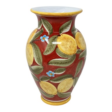 Vaso creato al tornio e dipinto a mano con decoro Positano, limoni e fiori su fondo colorato.
